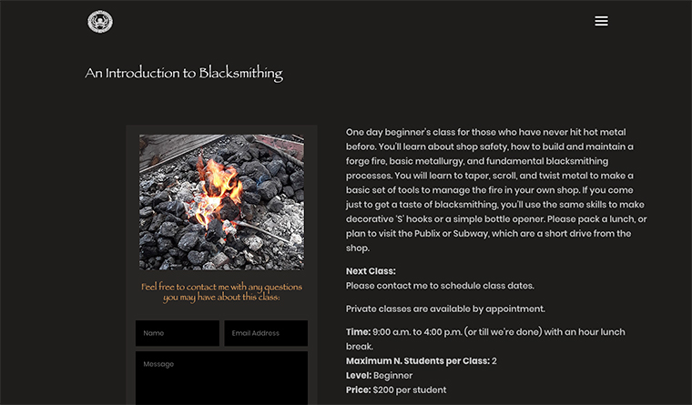 The best thing I can say for the web site? Kirk had a young student recently whose mother said she decided to bring her son to Kirk rather than other blacksmithing instructors in the area because his web site looked very professional.